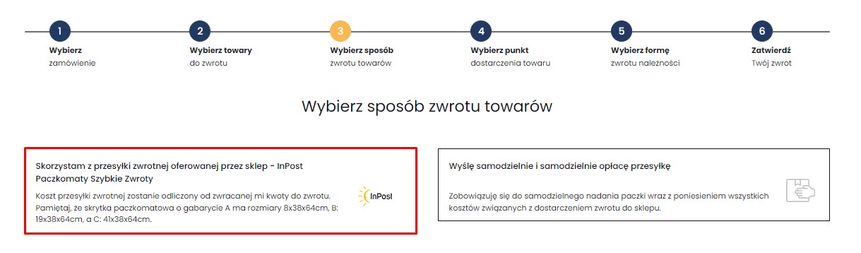 - Jeśli chcesz skorzystać z szybkich zwrotów za pośrednictwem Paczkomatów INPOST jako sposób zwrotu towarów wybierz "Skorzystam z przesyłki zwrotnej oferowanej przez sklep - InPost Paczkomaty Szybkie Zwroty" wskazując jednocześnie rozmiar nadawanej paczki.